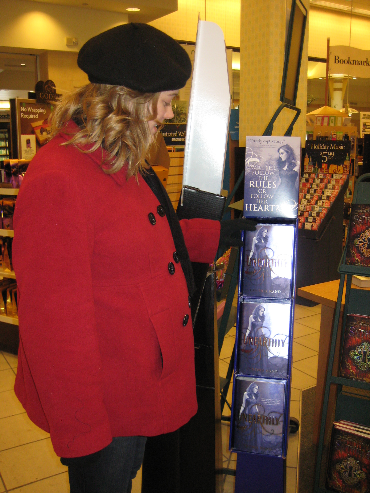 1) Go to your local bookstore and take 2 pictures, one of Unearthly on the shelf in all its booky glory (make sure we can see the other books around it, too, as part of the fun for me is seeing what company I'm keeping), and one of you holding the book.