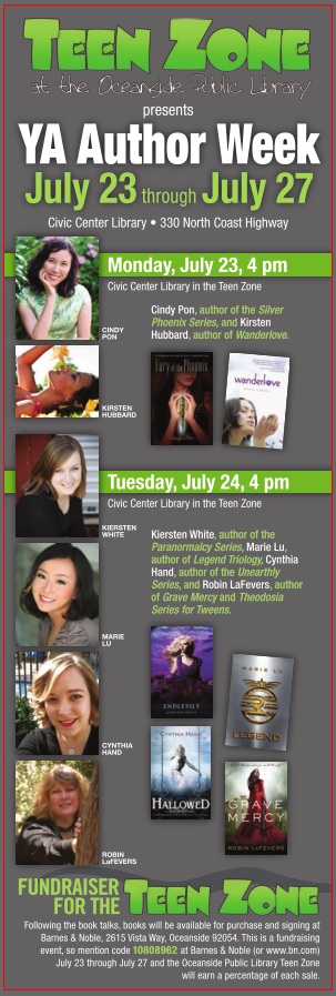 July 24, 2012, 6pm, at the Oceanside Barnes and Noble with Kiersten White, Marie Lu, and Robin La Fevers, all of whom I adore. (Okay, technically I haven't met Robin yet, but I adore Grave Mercy, so I am pretty darn likely to adore Robin as well.)