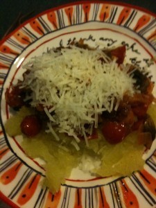 Meanwhile, take a whole spaghetti squash, pierce it , and microwave it for five minutes. Turn it over and microwave for another 4minutes. Check to see if it’s slightly soft. Let it cool for 5 minutes. Then cut it in half, scrape out the seeds, and use a fork to ‘comb’ strands. It’s a great low cal, low carb substitute for pasta.