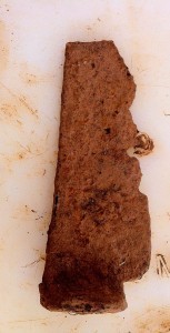 All artifacts point to the fact that Madison’s field slaves lived here around 1820 during his presidency and retirement at Montpelier. More than a hundred people worked here for a hundred years, then lived here for a hundred years, but I have not really felt anything from them. I imagined a scenario with the knife, the handle broke off and it was still used. And then the point. And someone- a man? a woman?- threw it away shrugging angrily and thinking this damn thing’s no good for nothing. But an iron knife must have been a prize possession, handled, and saved, and honored as an important utensil.