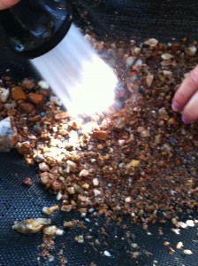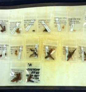 At the lab, we water screen the soil samples. The gallon of dirt is divided into three buckets; water and baking soda are added. Then it is stirred and poured through a ¼ gauge window screen; the clay/dirt is washed away until the water is as pale as weak tea.