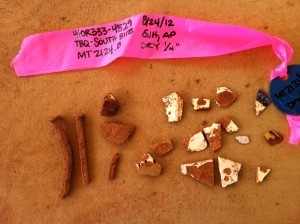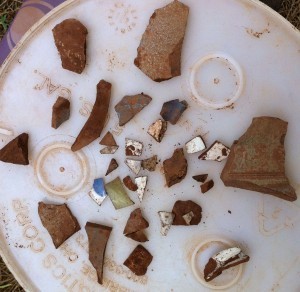 We start in again. My knees, hips, shoulders and wrists complain as I resume the crouched position. Then, low and behold a rock. A beautiful rock of quartz. One of the cobbles. The people who lived here had small houses, 16X16, that were used primarily for sleeping. All the work was done outside. Stones kept everything from getting too muddy, so there are rocks (not gravel, but cobblestones) placed outside their homes. Stones were also used for the hearth. Within minutes I find a piece of ceramic, white, with a blue flower, and a rim on the other side. And then a few minutes later, another one, and they actually mend together. I’m thrilled. Now these pieces are not very big, maybe a half inch, but a half inch of ceramics from 1820’s is much more exciting than endless red dirt.