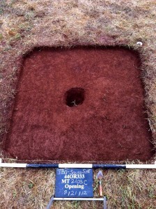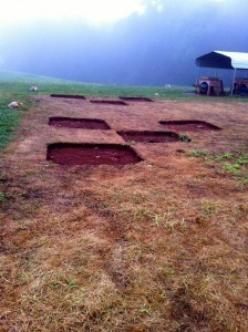 The site is littered with 5 x5 ft squares that are dug down 6-8 inches. The archeologist block out squares, dig through sod, roots, cobbles of rocks, artifacts and clay soil to find evidence of dwellings. Some show the cobbles of rocks, some only the dark red brown earth, some with hole dug in the middle that is a shovel test.