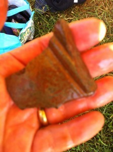 In the afternoon, I pick through the various pebbles to find artifacts and then put them in artifact bags. So what did I find? Bones. A pig’s tooth. A piece of a shell, perhaps of tremendous value, perhaps of curiosity, perhaps proof of trade so far from the sea. Lots of nails. A small iron hook, charcoal. It’s always fun finding things. The tooth was pretty exciting. And so was the iron hook.