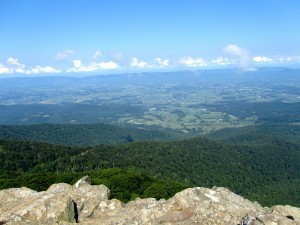 We start down Skyline drive, a curvy road through the Virginia’s Blue Ridge Mountains. Off to the right, at the edge of the mountain lays the plain of rich green squared off crops and farms, ponds, lakes. We hike on the ridge, climb a rock pile and reach the highest summit of the Appalachian trail to overlook the Piedmont. Beyond the ancient hills are the double blue ridges of mountains ringed with clouds.