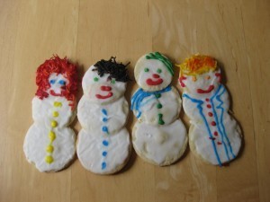 The rest is up to your imagination, and time. You can mix the remainder of the frosting with food coloring and paint features, or clothes on the snowmen. Store bought balls, sprinkles, or stars can become eyes or buttons. Frosting tubes add colorful scarves, stripes, shirts, pants, or hats.