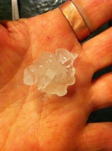 I returned to my work, answering emails, tweets, and posting on FB. The suspicious sounds continued, I went outside amazed at the size of the hail, the harshness of its pounding, and snapped a photo of one in my hand.
