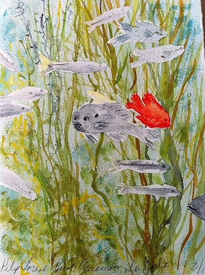 While I was in there, I visited an aquarium and captured images with my smart phone. Sitting by the sea, listening to the sounds of Yo Yo Ma accompany its lapping, I painted a picture of a kelp forest. One bright orange fish stuck among grey and silver fish, and dusty green of the fronds. I never before noticed the expressions on the faces of the fish. Some look like grumpy old men. Some look like sleek sirens. The bright orange one was good news in the midst of a recession. If you write, if you do art, if you run, if you dance, if you are one of the lucky ones you know the experience of awe that transports. If I’m lucky, I induce it through creation.