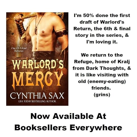 I also wrote the first draft of the first 5 chapters in Warlord’s Return, the next and the final Chamele Barbarian Warlords story (releasing in November). Oghul and his crew return to Carinae E and the Refuge, home of Kralj from Dark Thoughts, and I LOVE seeing all those (scarred) faces again.