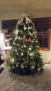 Cat Tree + Christmas TreeI could make a list of the things I have to be grateful for, but it’d be lengthy. I’m thankful that my daughter is happy and healthy. (If only her grades were decent, she’d be perfect!) I’m glad to have my family close. I’m glad we can keep the home warm, have our entire family over for Thanksgiving dinner and/or Christmas brunch, and still put presents under the tree without having to stress. We’re not wealthy, by any stretch of the imagination, but we’re still “rich” in the ways that truly count. So I’m grateful for that.