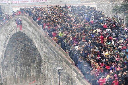 In Mianyang, Sichuan province, people drop old clothes and coins off Tai Ping Bridge every year to bring happiness and health. Happiness is an elusive concept in modern China.(Reuters / March 24, 2011)
