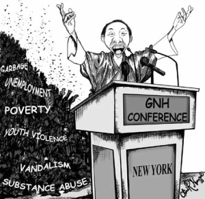 As always, there's much more to the story. Here's a cartoon from the Bhutan Observer that kind of sums up some of what won't come up today (and shows that the newly granted freedom of the press is flourishing there. That's the prime minister at the podium.) It's the reality of today's Bhutan: