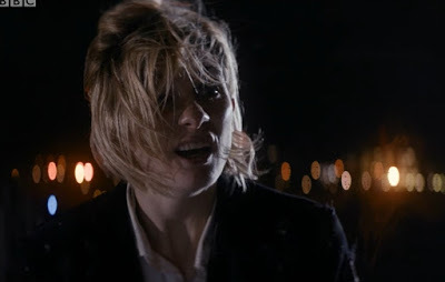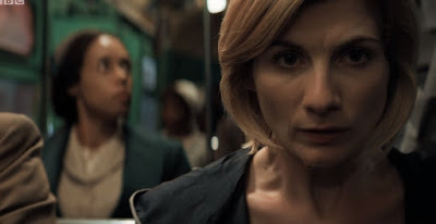 "Any thoughts on costume?""Well, if we can agree on one thing, it's that we don't need a hat."In amongst all the obvious stuff – including a heroic death scene where the character a) immediately accepts they are going to die, b) delivers some caring last words off the top of their head and c) slips away quickly like Marion Cotillard – there’s some unambiguously good stuff. The Doctor is sometimes really funny, like her enthusiastic response to wiping Ryan’s phone (“All my stuff is on there!” “Not any more!”), and there’s a lovely scene where she describes regeneration as a moment when you think you’re going to die, and then you’re born. This is very apt stuff, like my favourite scene in The Power Of Three – and this time there’s no possibility that Steven Moffat edited it! I even like that flowery little line, “I’m not yet who I am,” which is the kind of glorious nonsense that only makes sense in this context. It’s just a pity the Doctor’s vagueness re who she is is so, well, vague: she doesn’t remember her name. Everything else, down to knowing she needs a sonic screwdriver for scrapes like this, is clearly present and correct from the minute she crashes through a train roof. Like that awkward “You had no right to do that!”, and the nothingy scene of the Doctor choosing a new costume (spoiler, she goes to a shop), it’s just sort of there.