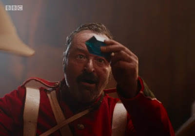 Pretty soon a tomb is discovered, and an especially sticky-fingered idiot presses the wrong thing and awakens an Ice Warrior. Sigh; this isn’t the first time Gatiss has added a greedy dimwit just to get the plot rolling, and the last time he did it was also an Ice Warrior episode. (In Cold War, another absolute moron seemingly gets bored waiting for the title sequence, so he blow-torches a frozen Ice Warrior. D’oh!) The whole scene is a groan-worthy reminder of how Gatiss handles period pieces, i.e. with all the stock stereotypes he can muster. It’s “ruddy” this and “what!” that; when a lowly officer whines that he didn’t get any tea, his Sarge says “RHIP!” Oh dear, are they going to spell that out? “Rank Has Its Privileges!” Of course they are. (Oh, and no prizes for guessing Sarge has been slipped a mickey.)