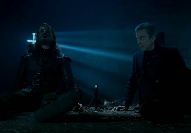 Most of the comedy comes from Peter Capaldi reacting abrasively to his surroundings. The Doctor's refusal to believe is the backbone of the episode, and it's intrinsically like this new Doctor, as well as being just a shade like William Hartnell. (Again, still not wildly original re Robin Hood. See Blackadder: Back & Forth for much the same material.) That's all to the good, but the way it's handled is a bit too broad, boiling down to the Doctor and Robin yelling at each other until Clara tells them to shut up. It's more monotonous than funny, and it doesn't give Peter Capaldi much to work with, or at least much that's good. I'm against pigeon-holing the Doctor's personality; he thrives on strangeness, not predictability. It's certainly too soon to stuff the Twelfth Doctor into a little box marked Rude And Grumpy, but that's what this one does. Capaldi is better than this, not to mention all the dry exposition he's made to spout. That bit on the spaceship is sheer one-sided yak, yak, yak.