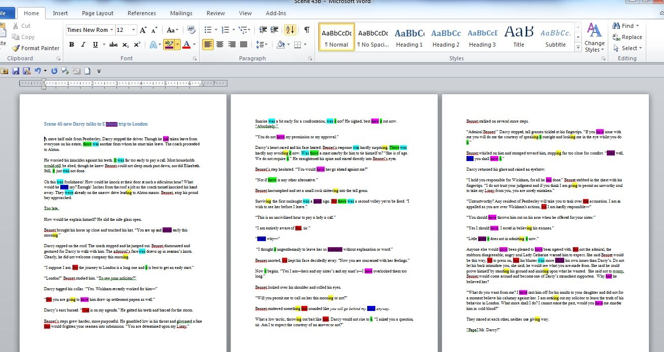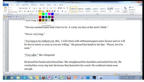 1. Go into word and set the highlight function to a specific color. I start with yellow.(picture 1). I use 7-8 colors on each pass, each one for a different purpose. More on that bit later.