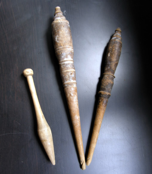 In order to increase the spin, a whorl was added. The spindle, or rod, usually had a raised lip to hold the whorl. A wisp of prepared wool was twisted around the spindle, which was then spun and allowed to drop. They are amongst the most common Medieval finds, as the process of spinning was the most common occupation. The majority of whorls were made from stone or recycled pot but some were carved from wood or cast out of lead.