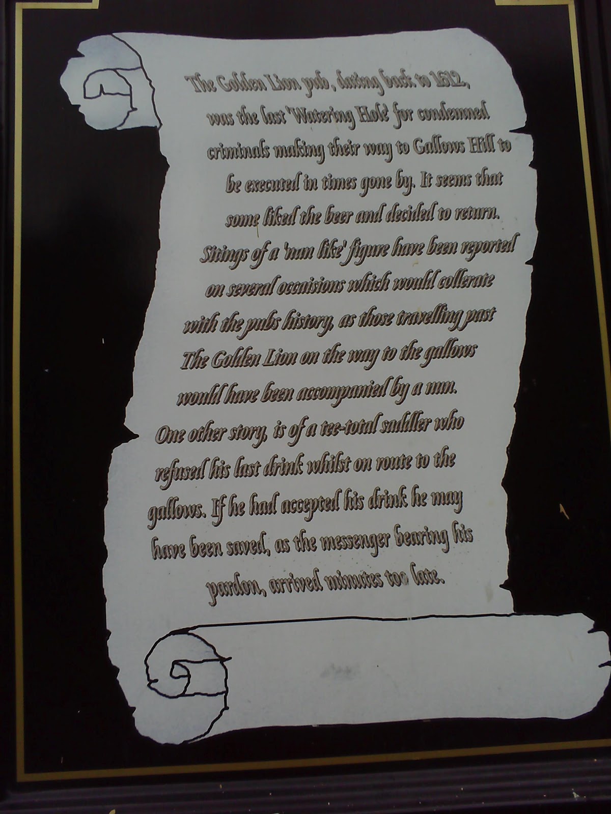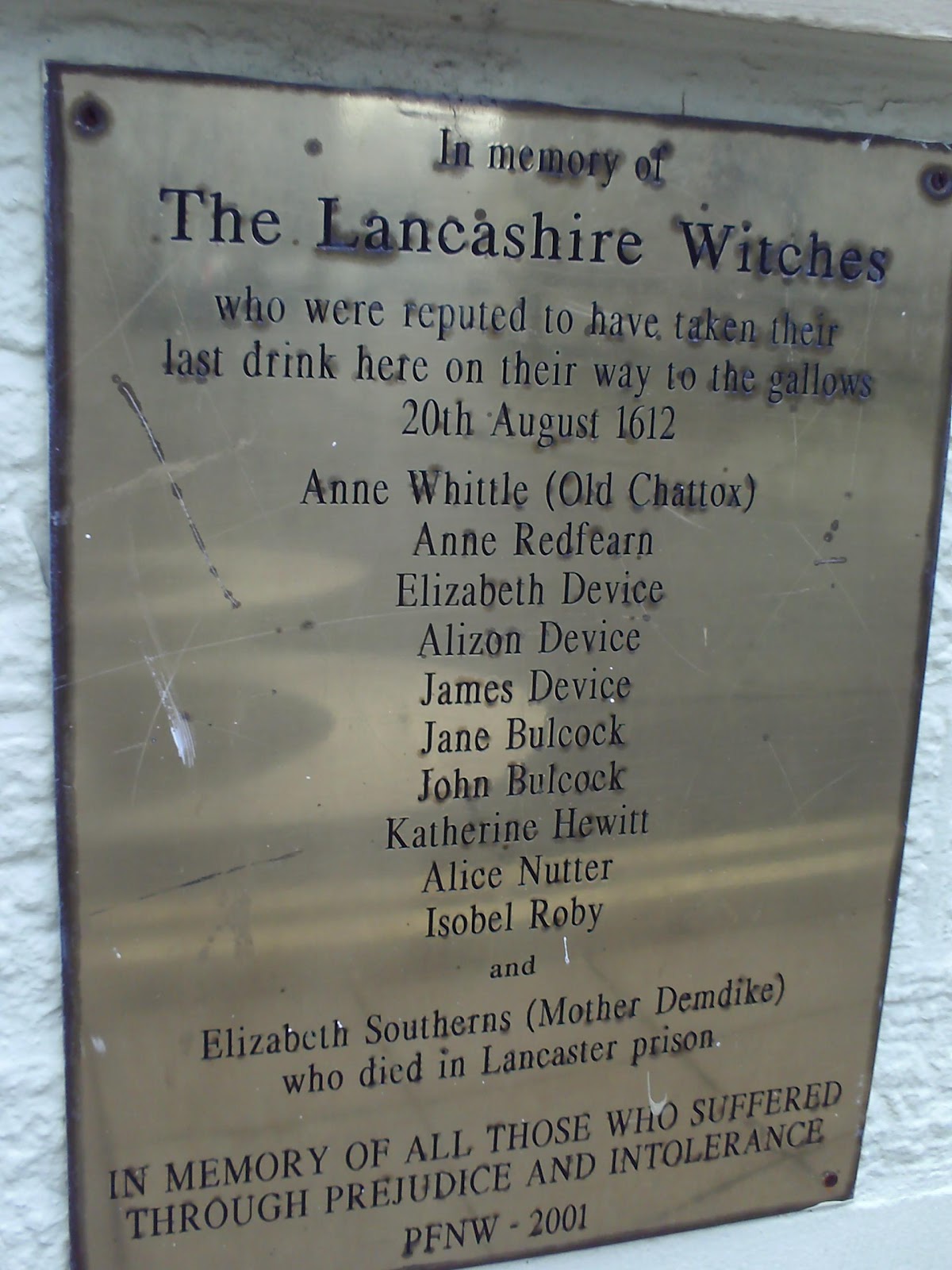 I parked in a car park opposite this pub, The Golden Lion, a few weeks ago on the way to the shops in Lancaster. As I passed it I remembered that this was the spot where the famous Pendle witches stopped for a last drink before being taken to Gallows Hill to be executed.I stopped to read the two plaques that are on the wall. The scroll gives the passer-by a little information, and the brass plaque is like a memorial and lists the names of those who were executed.