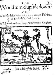 Also popular subjects were ridiculing the fads and fashions of the day, as in this pamphlet about ridiculous fashions, The World Turned Upside Down.In order to get material, the seventeenth century writer