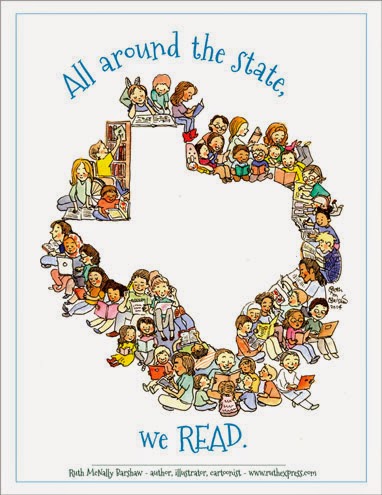 While in Texas Charlie and I presented writer workshops at four schools in Round Rock, and we attended the Texas Library Association conference in San Antonio where we handed out these Texas READ posters: