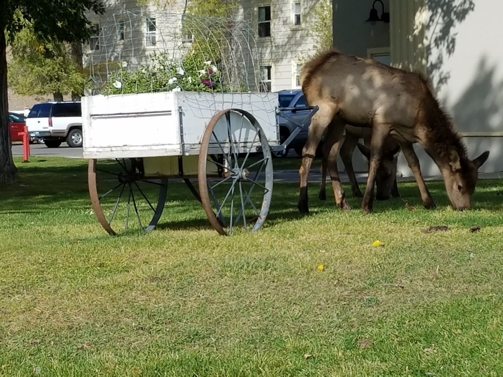A young elk grazing on the lawn in front of theMammoth Hot Springs Hotel