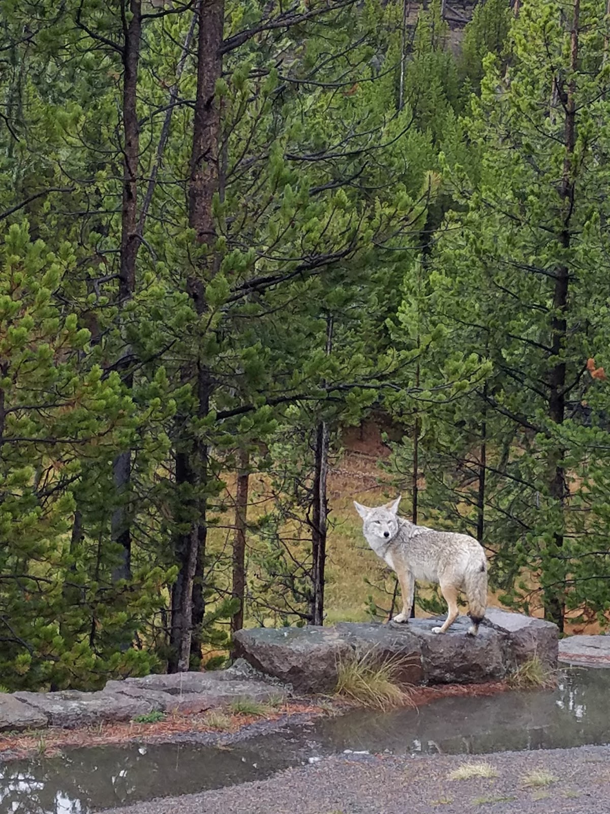 A Coyote posing for a pictureYou never know what animal will step out as you drive along.We had coyotes, elk and bears.Where's your favorite place to visit?