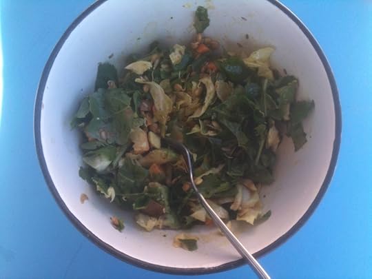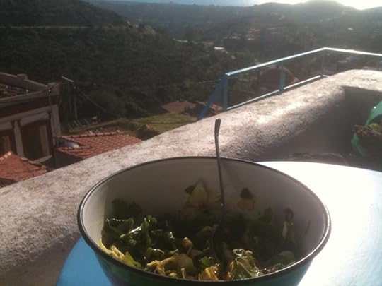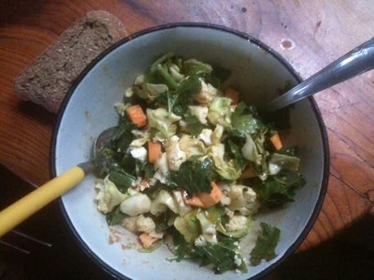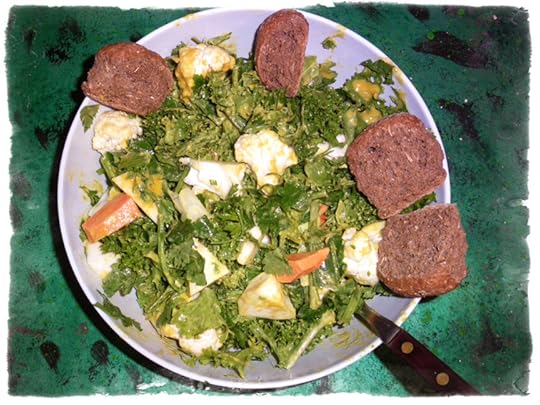 Τα κάνετε όλα μικρά κομματάκια, τα φυλλώδη με το χεράκι, όχι με μαχαίρι, γεμίζετε με το μείγμα την “χριστουγεννιάτικη γαβαθούλα”, ανακατεύετε πολύ καλά με κουταλοπίρουνα και έτοιμο το γεύμα. Όλα ωμά εντελώς, μην τα ξαναλέμε. Ταιριάζει μαζί και παξιμάδι κρίθινο