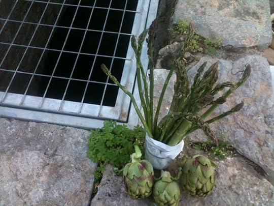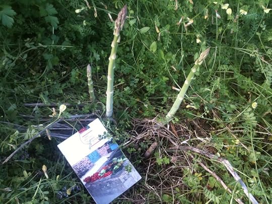 Βγαίνοντας το πρωί για να πάω στο ταχυδρομείο να στείλω Το ζουμί του πετεινού στην τυχερή της χθεσινής κλήρωσης Κική Τσ. στην Κοζάνη, έπεσα πάνω στα σπαράγγια του χωραφιού, που μόλις φυτρώσανε. Το έβαλα λοιπόν το βιβλίο στα πόδια τους για μετράρι και τα φωτογράφισα. Μη μου πείτε ότι δεν έχουν φωτογένεια;;