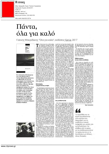 Από τα καλύτερα του Μακριδάκη (που όλα είναι καλά, τι να λέμε τώρα). Στο «Όλα για καλό» θαύμασα για ακόμη μια φορά τον τρόπο που ξετυλίγεται η ιστορία, που ο συγγραφέας μέσα από τα λόγια του αφηγητή σε προϊδεάζει γι’ αυτό που θα ακολουθήσει χωρίς να σου αποκαλύπτει πολλά, έτσι ώστε να σε κρατάει διαρκώς σε αγωνία. Γεμάτο ανατροπές και αποκαλύψεις, με χαρακτήρες αληθινούς όπως πάντα και με συναισθήματα τόσο έντονα που νιώθεις την καρδιά σου πότε να χτυπά δυνατά και πότε να λιώνει. Το τέλος γλυκόπικρο όπως αρμόζει, σε κάνει να θες, με το που κλείσεις το βιβλίο, να πεις ένα ευχαριστώ στο συγγραφέα για όλα όσα σου έχει προσφέρει.