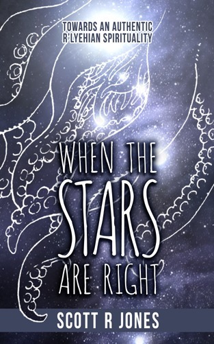 Scott R Jones‘ When The Stars Are Right: Towards An Authentic R’lyehian Spirituality is at the printers, but you can pre-order this game-changing title NOW directly from Martian Migraine Press. The book itself is a perfect-bound paperback, 128 pages printed on acid free, elemental chlorine free paper containing 40% post consumer content. (We’re doing our best when it comes to Keepin’ It R’lyeh with the environment, natch!)