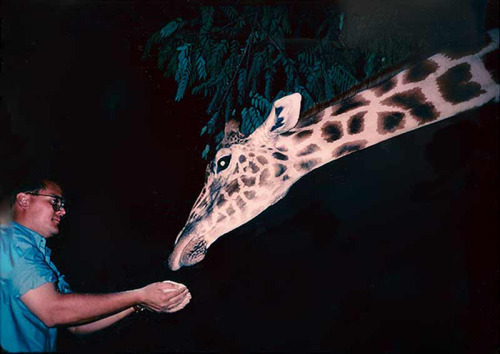 1995 Kenya - feeding the Giraffe Manor animals across the valley.