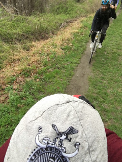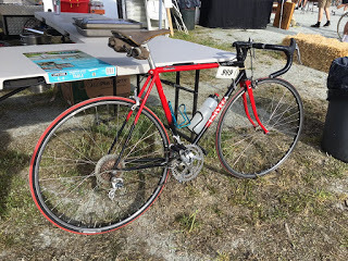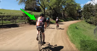 Things started out well enough; thanks to all those sumptuous Eroica California miles I was feeling pretty good, and you can even see photographic evidence of my participation here. (I'm the Fred in black on the Specialized.) However, on about the 4th time up the hill I felt a softening in my front tire, and by the time we passed by the start/finish my rim was bottoming out. So I stopped, repaired he flat, and jumped back on the next time the group came around. Of course, being a lap down, I stayed all the way at the back of the field and out of everyone's way, even though it's not only against the series rules but also grounds for suspension: