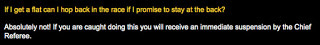 (Also, in my defense, I never even noticed that rule until today, so I figured what I was doing was fine. But yes, ignorance is never an excuse, even though I possess it in liberal quantities. I've only been racing in the parks for like 20 years. Why would I bother to learn the rules in that time?)