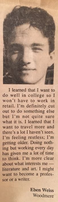 So there you go, that's my resume, and I don't think the teenager who used to struggle emotionally when a band he liked signed to a major record label would be too offended by my career trajectory, downward as it may be. In fact, thanks to this slightly embarrassing newspaper clipping from like the Nassau Herald or something, I daresay I fulfilled my modest ambitions: