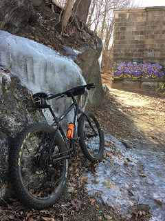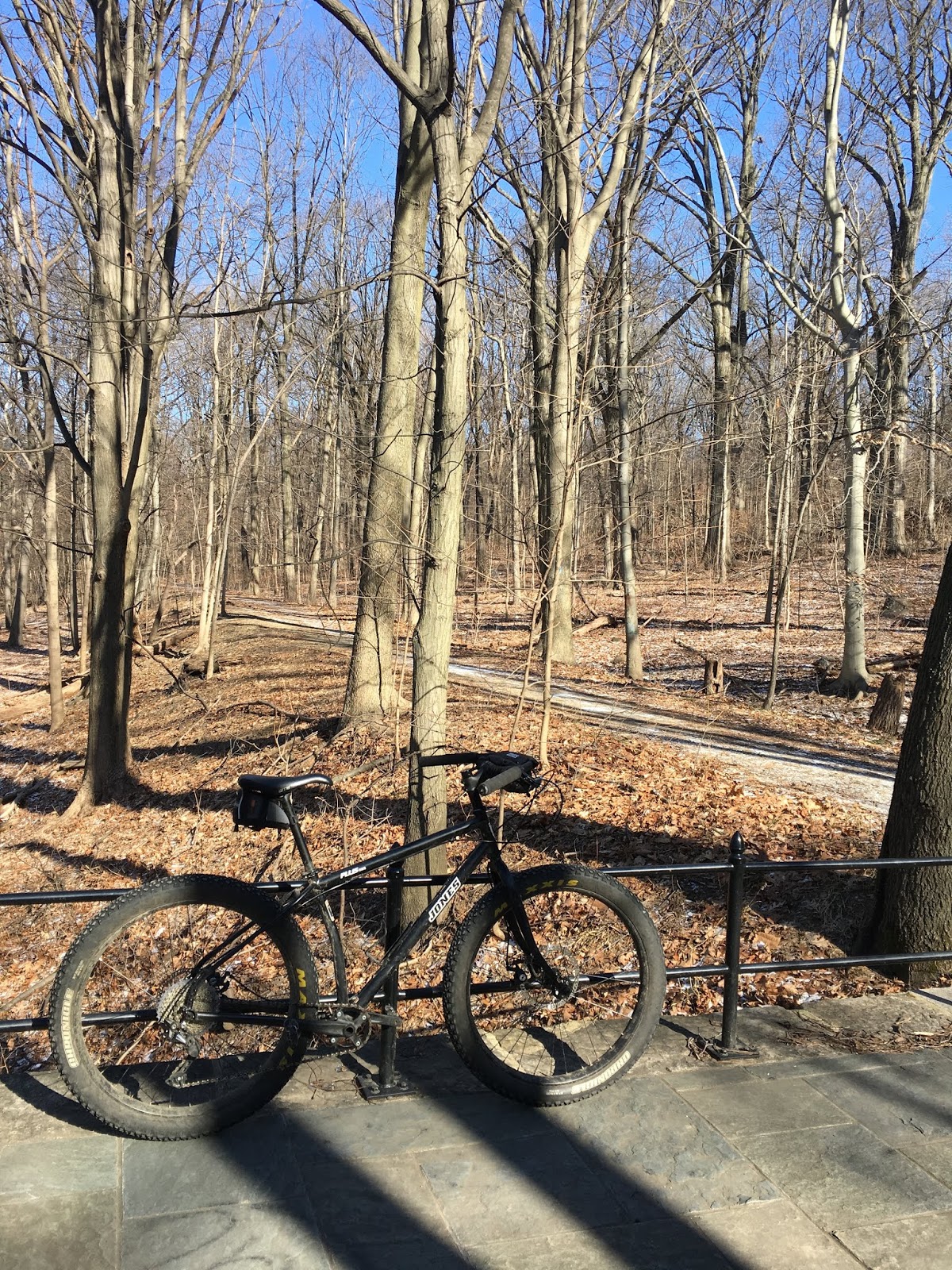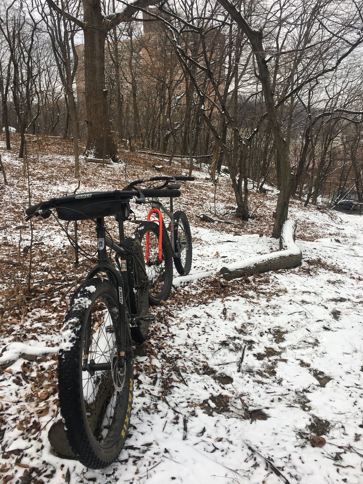 Then Friday brought a dusting of snow, which meant more perfect conditions for plus-sized tires, so I met up with a friend for jaunt to the Highbridge trails in upper Manhattan: