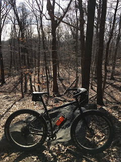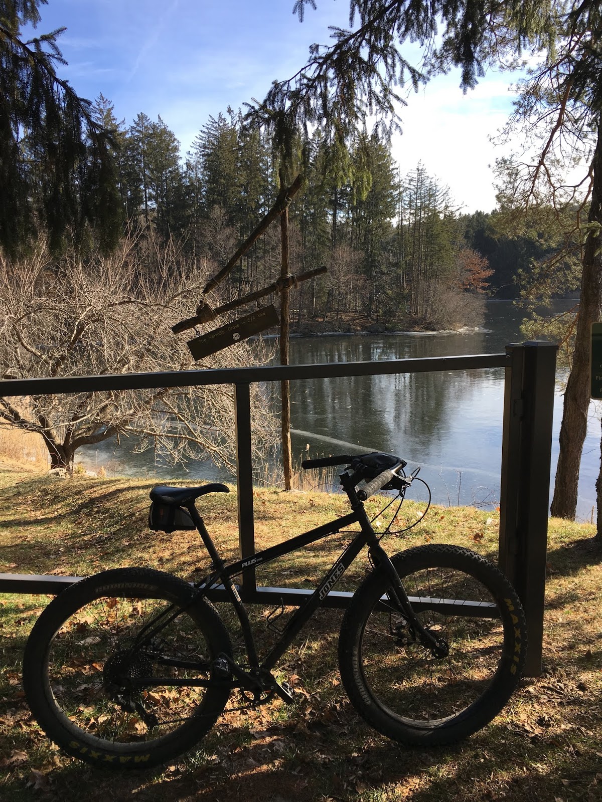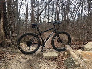 I almost always ride a singlespeed at Cunningham because the smooth, rolling terrain is ideal for riding without shifting. However, this time I took the Jones, and I'm glad I did, because there were lots of frozen ruts left behind from people riding in the mud and I was able to float right over them thanks to those plush, grippy, and apparently out-of-style plus-sized tires.