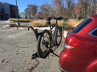 With just a short time to ride on Saturday morning, and with temperatures well below 30 American Freedom Degrees™, the prospect of a road ride seemed terribly unappealing and I didn't have enough time to ride to and from the nearest mountain bicycling trails. So in a great big selfish "Fuck You!" to the environment, the streets of New York City, and smugness in general I fired up THE CAR THAT THE BANK OWNS UNTIL I FINISH PAYING THEM BACK and drove my lazy ass to Queens--utilizing the Saris SuperClamp EX of course, with which I remain quite pleased: