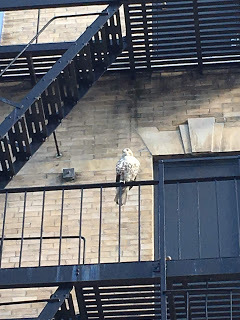 It swooped by me rather dramatically, but I was only able to get a picture once it alighted on a fire escape a few stories up.