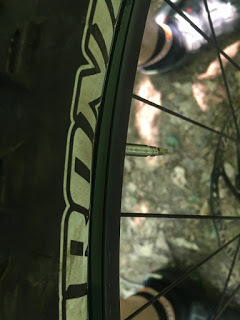 The Jones is tubeless-ready, but of course it comes with tubes installed. The Marin is also tubeless-ready, and it also comes with tubes installed. But while I've never had any difficulty replacing a tube on the Marin (which I guess is why I never bothered to go tubeless in the first place), the Jones was another story. The wheel/tire combo is snug. Really snug. Of course you want this when you're setting up tubeless, but when you're using tubes in the woods what it means is a protracted struggle that involves sweating profusely as mosquitos swarm all around your person and you push your wimpy thumbs to the breaking point.