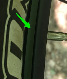 Then, when I finally got the tube in, it turned out my diminutive hand pump was not powerful enough to push the tire bead completely out of the channel in the center of the rim. (The fact that I was using an undersized tube didn't help.) That meant that even at maximum pressure there was a gap between the tire bead and the rim that looked like this: