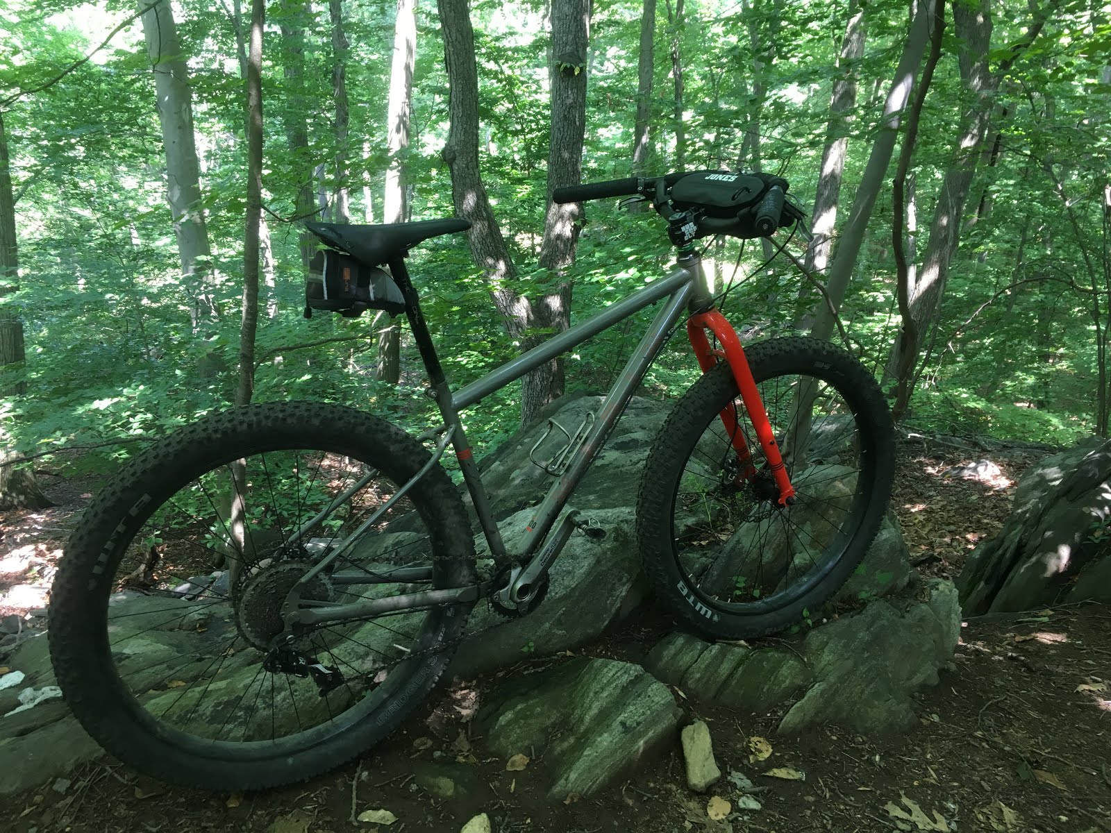 However, so far my impression of the Jones is that it's a more nimble and at the same time more balanced bike fore and aft than the Marin (or at least the Marin as I've curated it). You notice this when you hop over logs--it feels like you're sitting more in the middle of the Jones, and so the front and rear wheels come up and over a little more naturally. (The Jones makes you want to hop over things more.) It's also better on climbs, particularly twisty ones: on the Marin the front wheel kind of wants to pop up, especially if you hit a rock or a root, whereas the Jones fees more planted--yet at the same time it makes you want to pop wheelies. (In fact I attempted to oblige some teenagers who requested a wheelie as I passed, and while my wheelie was brief and pathetic it did pass muster with them, so there.) Overall I'd venture to say the Jones is a snappier and more lively bike than the Marin, including on the road where getting out of the saddle and rocking the bike back and forth feels maybe a little more natural.