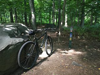 As I mentioned yesterday, I've got a new testcycle, and I've just returned from Day 2 of intensive backwoods testing in the wilds of Westchester county where I duly put the bicycle through its paces on the forbidding Trails Behind The Mall: