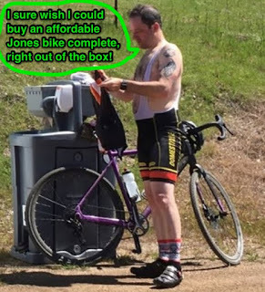 Now you love the bike even more, but having basically turned your bike into a Jones you realize that now you want an actual Jones. After all, you're never going to put a suspension fork on that suspension-corrected bike, and Jones bikes are designed as though bicycle suspension doesn't even exist, which you find tremendously appealing. However, getting a Jones isn't necessarily a cheap proposition. Even the least expensive frame and fork is more than a thousand bucks, and you've got to build it up from there.
