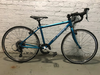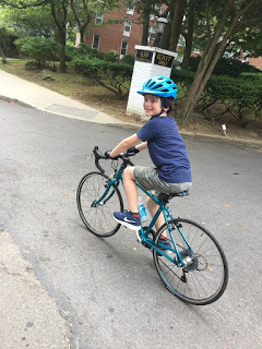 Drop bars certainly aren't for every child but this one seems to have inherited the cursed gene that causes some of us to gravitate to them. They're very natural to him, and it's heartening to watch him master the various hand positions and learn how to remove and replace his water bottle while riding. Also, if you're grooming a juvenile Fred or Frederica, here's one bit of advice: keep a safe distance. As a parent I prefer to ride behind my child so I can keep an eye on the situation at all times, but they're completely incapable of taking your presence into account when braking. (Or at least this one is.)