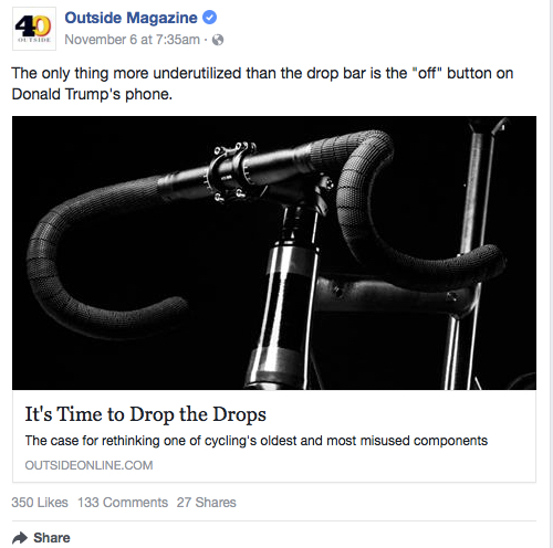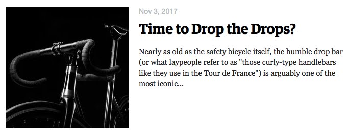 Sorry for the late post! It's been an exciting morning. Firstly, my latest Outside column is up and it explores the question of whether or not drop bars are obsolete: