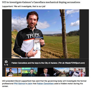 Moving on, the UCI is going to investigate Fabian Cancellara after Phil Gaimon, in his latest book, accüsed him of motördoping: