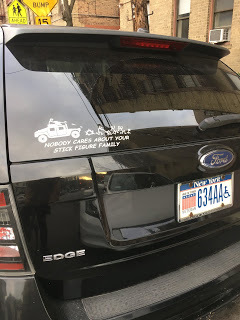 I've posted a photo of this vehicle before (I can't be bothered to look up when) but yesterday I happened upon it again and took a clearer picture while looking frequently over my shoulder as you can probably imagine. This car conveys a bewildering--and I daresay uniquely American--set of messages. Specifically, the license plate informs fellow road users that he (I'm going to go out on a limb and say the owner is a man) is a veteran of the "War on Terror" and has ostensibly put his life on the line to keep us all safe, yet the decal informs me that he wants to rain death and destruction upon me and my family. Frankly, it's hard to know what to make of any of this, so, uh...thank you for your service? Oh, and also please don't kill me.