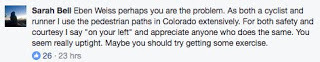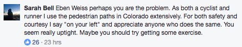 Sarah Bell Eben Weiss perhaps you are the problem. As both a cyclist and runner I use the pedestrian paths in Colorado extensively. For both safety and courtesy I say "on your left" and appreciate anyone who does the same. You seem really uptight. Maybe you should try getting some exercise.