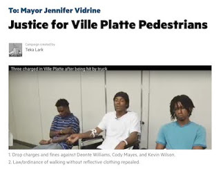 The Ville Platte, Louisiana, Police Department (VPPD) and the Evangeline Parish Sheriff’s Office (EPSO) was found by the Department of Justice in December of 2016 "to engage in a pattern or practice of conduct that violates the Fourth Amendment to the Constitution" and instead of its politicians condemning the police and sheriff for such behavior they support and encourage it and actively use the police and sheriff for punitively enforcing mobility limiting and Civil Right violating policies, such as the walking curfew and mandating reflective clothing when walking.Regardless of where you're Black, whether it be in the metropolitan cities of Los Angeles & New York or in rural Ville Platte, Louisiana, you deserve justice. You deserve #TransportationEquity #BicycleEquity.