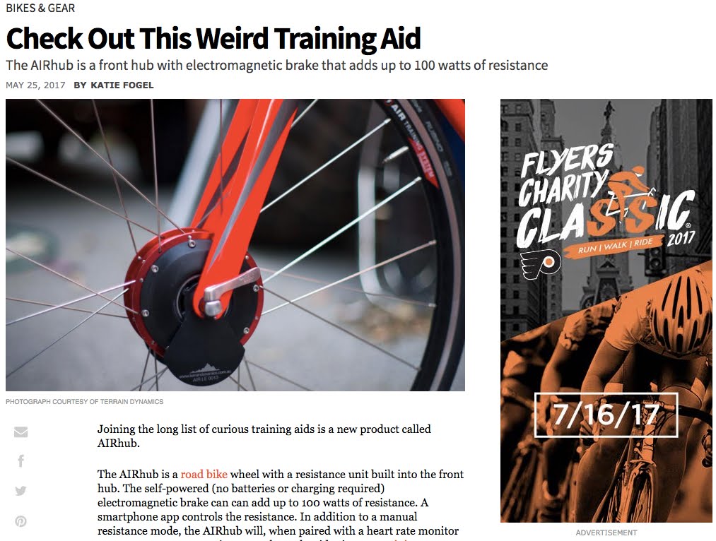 The AIRhub is a road bike wheel with a resistance unit built into the front hub. The self-powered (no batteries or charging required) electromagnetic brake can can add up to 100 watts of resistance. A smartphone app controls the resistance. In addition to a manual resistance mode, the AIRhub will, when paired with a heart rate monitor or power meter, vary resistance to keep the rider in a set training zone.